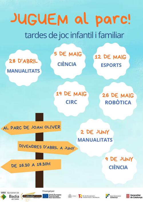 Demà, divendres 28 d'abril, s'inicien les activitats Juguem al Parc!, per a infants de 6 a 12 anys i les seves famílies. L'activitat es durà a terme també els divendres 5, 12, 19 i 26 de maig, i 2 i 9 de juny, de 16.30 a 18.30 hores, al Parc de Joan Oliver. Les activitats són gratuïtes i no cal cap inscripció prèvia.
