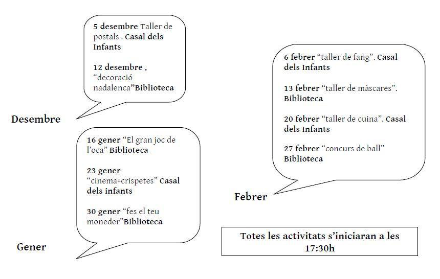 Entre els tallers que s'organitzen n'hi haurà de cuina, de modelar fang, de fer màscares o per aprendre a fer moneders. Pel que fa a les activitats, el dia 23 de gener hi haurà Cinema+crispetes i el 25 de febrer, Concurs de ball. El proper taller serà aquest divendres, dia 12 de desembre (Decoració nadalenca).