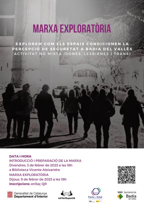 L'Ajuntament t'ofereix, aquest divendres, de 18 a 20 hores, la sessió formativa sobre marxes exploratòries per a dones, que tindrà lloc a la Biblioteca de Badia. Aquesta sessió explica en què consisteixen aquestes marxes on les dones analitzen els elements físics i socials que condicionen la seva percepció de seguretat a la via pública. La marxa exploratòria per Badia es farà el dijous 9 de febrer a les 18 hores i començarà a la plaça de l'Ajuntament. Et pots inscriure en aquesta adreça https://bit.ly/MarxaExploratoriaBadia.