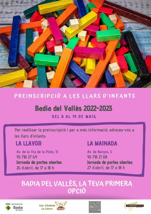 El mes de maig vinent s'inicia el període de preinscripció a les Llars d'infants de 0 a 3 anys per al curs 2023–2024. A Badia del Vallès hi ha dues llars d'infants La Mainada i La Llavor, de titularitat del Departament d'Educació. Si vols inscriure per primer cop el teu fill o filla, o vols canviar de llar, pots sol·licitar una plaça fent una sol·licitud de preinscripció.