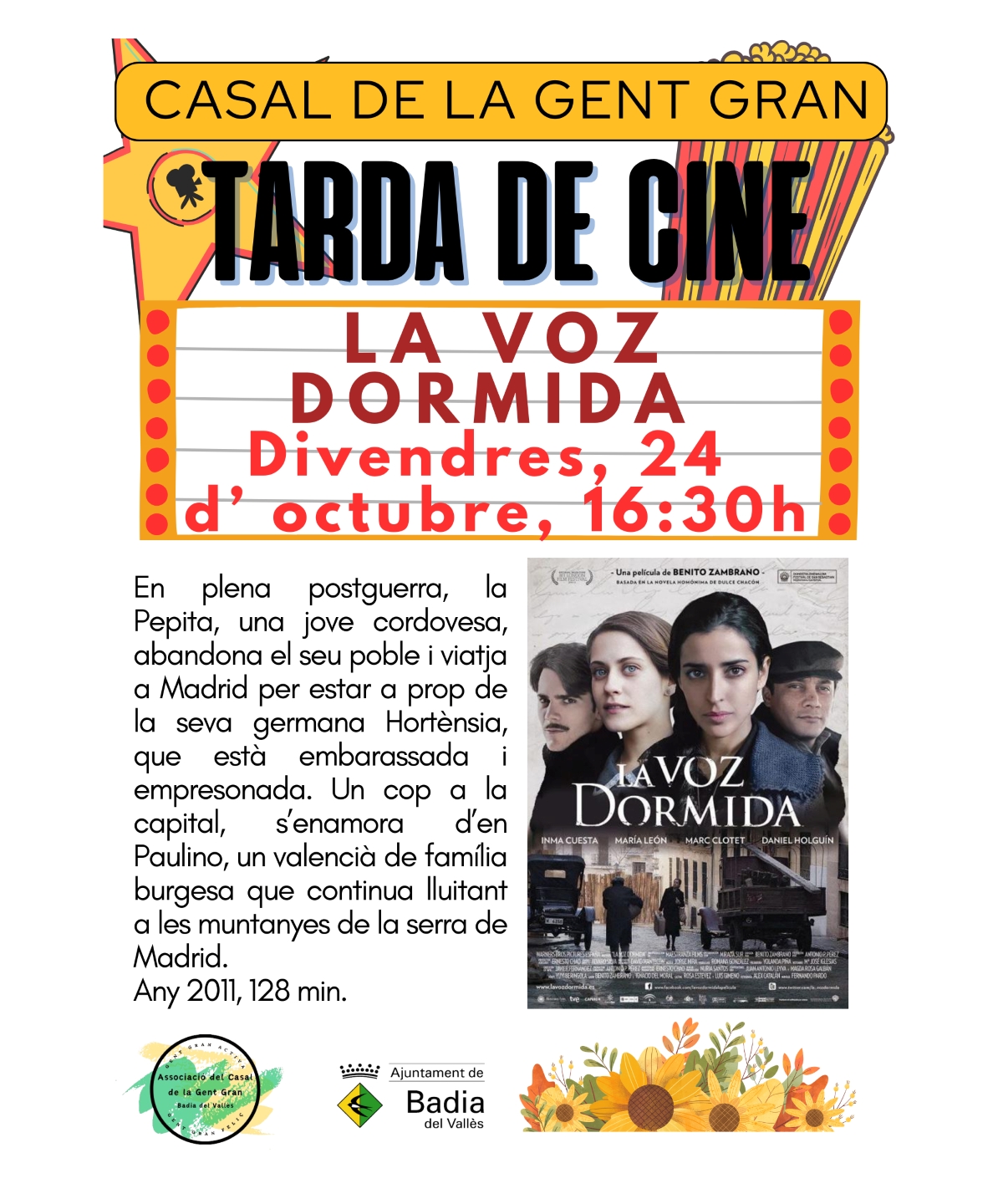 Demà divendres, 24 d'octubre, a les 16.30 hores, el Casal de la Gent Gran projectarà la pel·lícula La voz dormida, del director Benito Zambrano, basada en la novel·la homònima de Dulce Chacón.