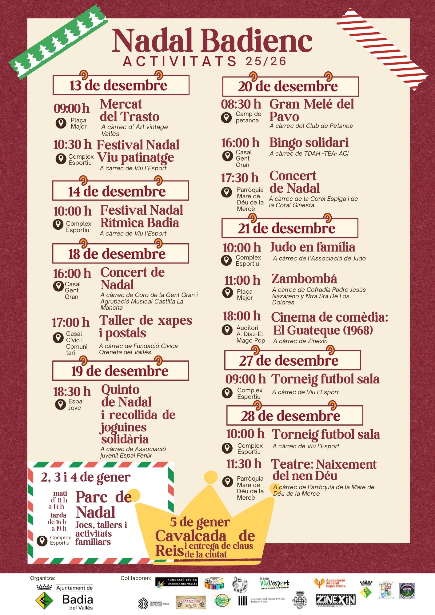 Els actes comencen dissabte, 13 de desembre, amb l'edició de Nadal del Mercat del Trasto, a càrrec d'Art Vintage Vallès, a partir de les 9 hores. A les 10.30 hores, el Complex Esportiu oferirà el Festival de Nadal Viu patinatge, a càrrec de Viu l'Esport.