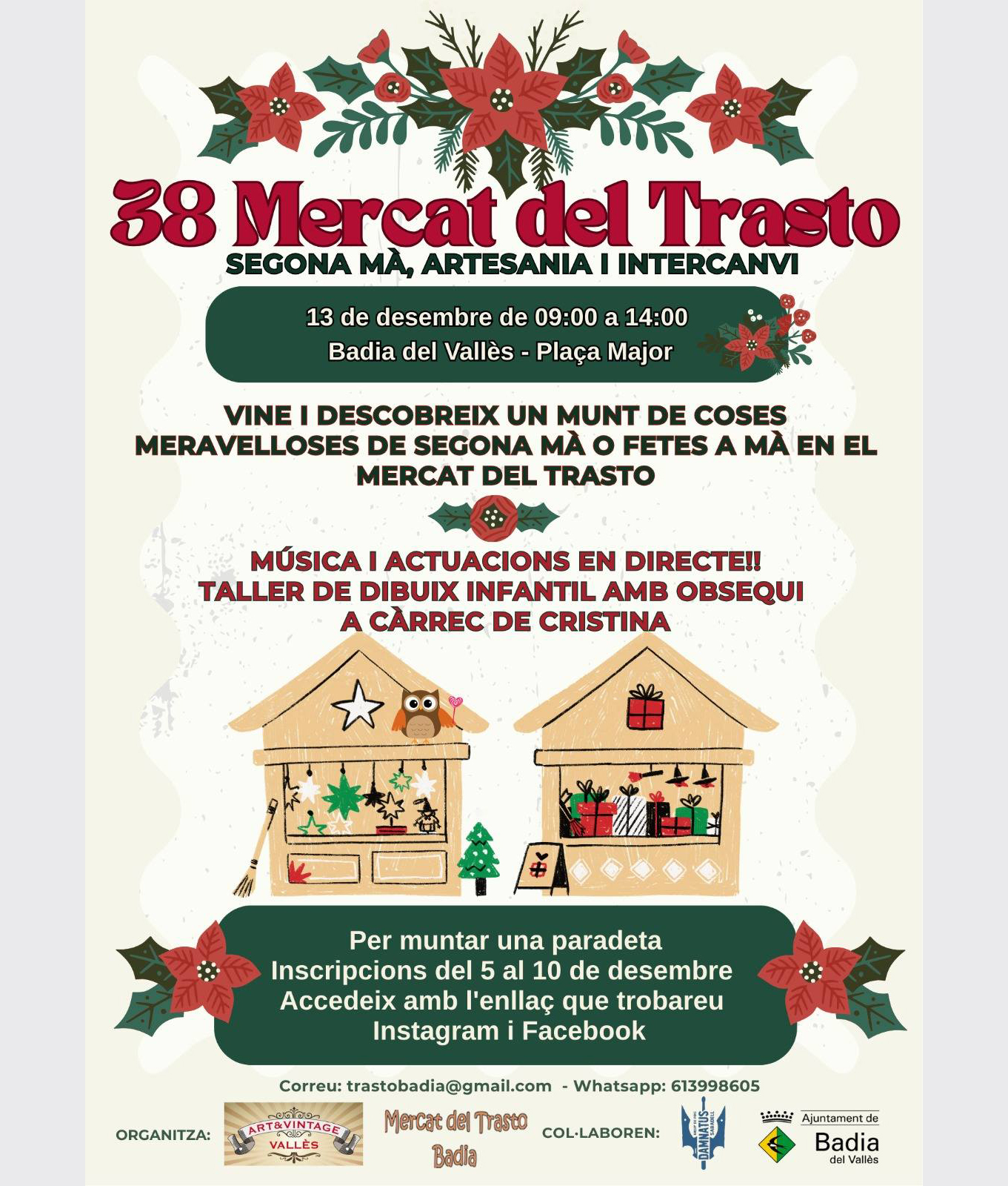 Demà dissabte 13 de desembre, de 9 a 14 hores, vine al 38è Mercat del Trasto de Badia del Vallès, organitzat per l'entitat Art Vintage. Hi trobaràs paradetes amb productes artesanals i materials reciclats, roba de segona mà, i moltes sorpreses, amb actuacions en directe, taller de dibuix infantil amb obsequi a càrrec de Cristina, i ambientació de música vintage.