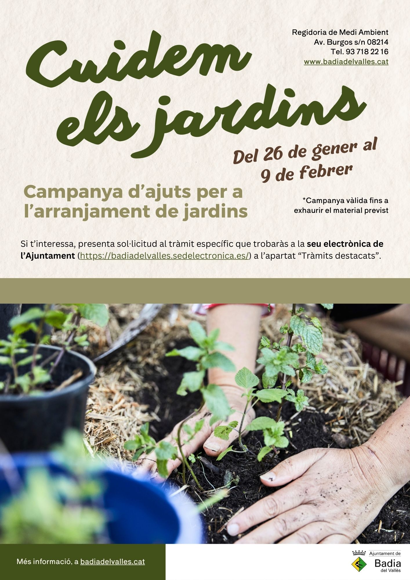 Les comunitats veïnals interessades a sol·licitar material de jardineria (terra i plantes) per al condicionament dels seus jardins, podeu presentar una sol·licitud, a partir de dilluns vinent, 26 de gener, a la Seu Electrònica de l'Ajuntament, al tràmit específic, dins de l'apartat Tràmits destacats: https://badiadelvalles.sedelectronica.es/. La inscripció l'ha de fer la persona representant de la comunitat: gestoria o presidència.