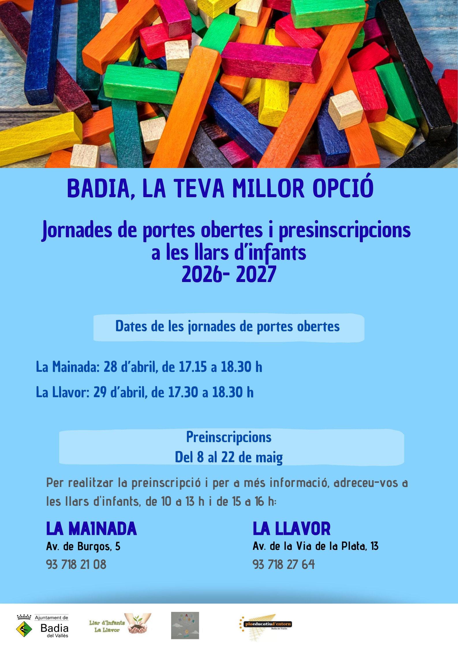 Si necessites resoldre qualsevol dubte, pots adreçar-te al Servei d'Educació de l'Ajuntament de Badia del Vallès al 93 718 16 62 i al 670 756 559. A més, també pots consultar les llars d'infants: