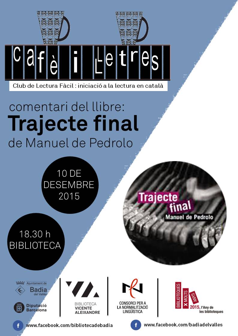En aquesta sessió del "Cafè i lletres", Club de Lectura Fàcil - iniciació a la lectura en català, que organitza la biblioteca Vicente Aleixandre en col·laboració amb el Servei Local de Català, es comentarà el llibre Trajecte final, de Manuel de Pedrolo.