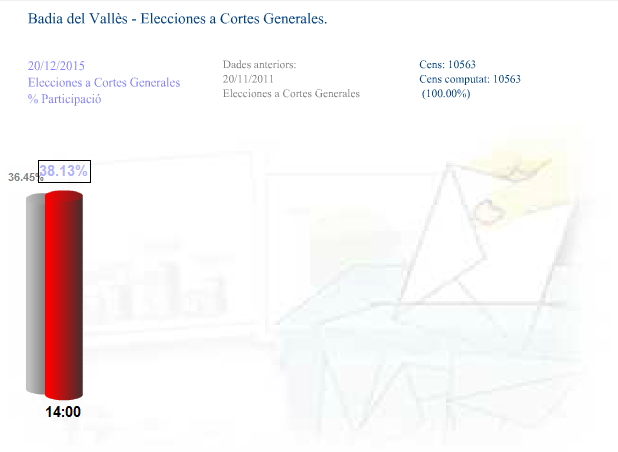 Les primeres dades de participació a les Eleccions Generals d'aquest 20 de desembre de 2015 s'han conegut fa pocs minuts, al voltant de les 14 h. A aquesta hora, Badia del Vallès registrava una participació del 38,13 %, xifra superior a la registrada a la ciutat a la mateixa hora als comicis de 2011 que, aleshores, va ser del 36,45 %.