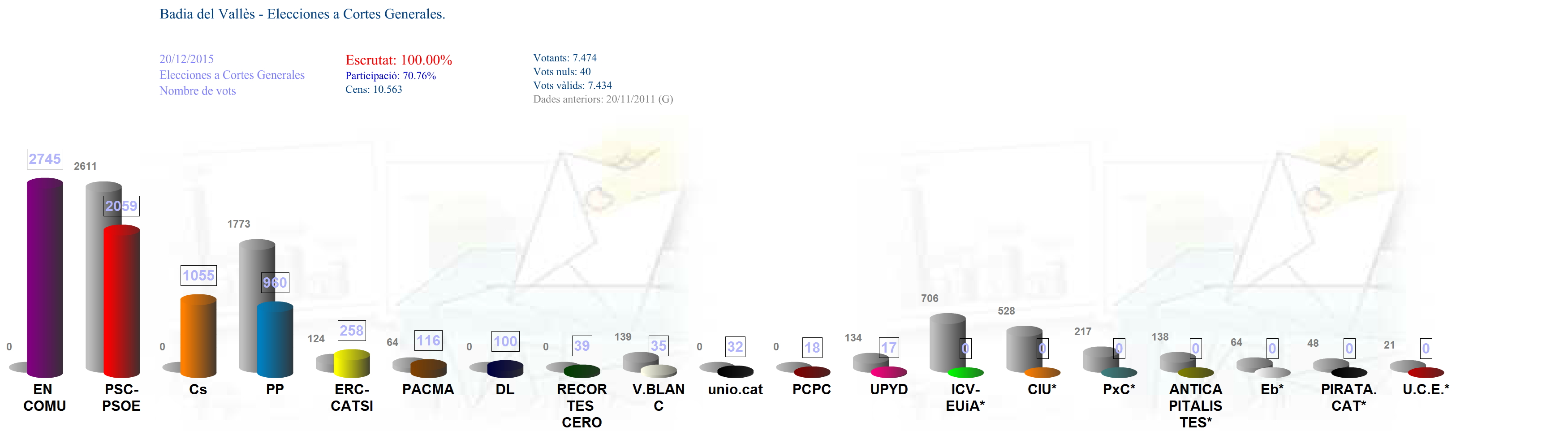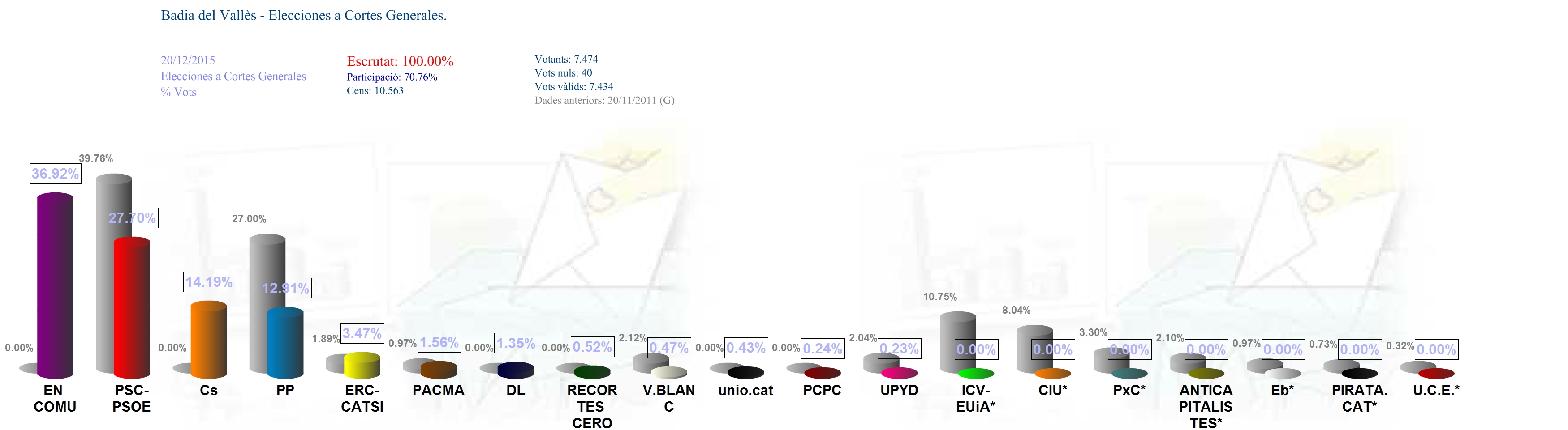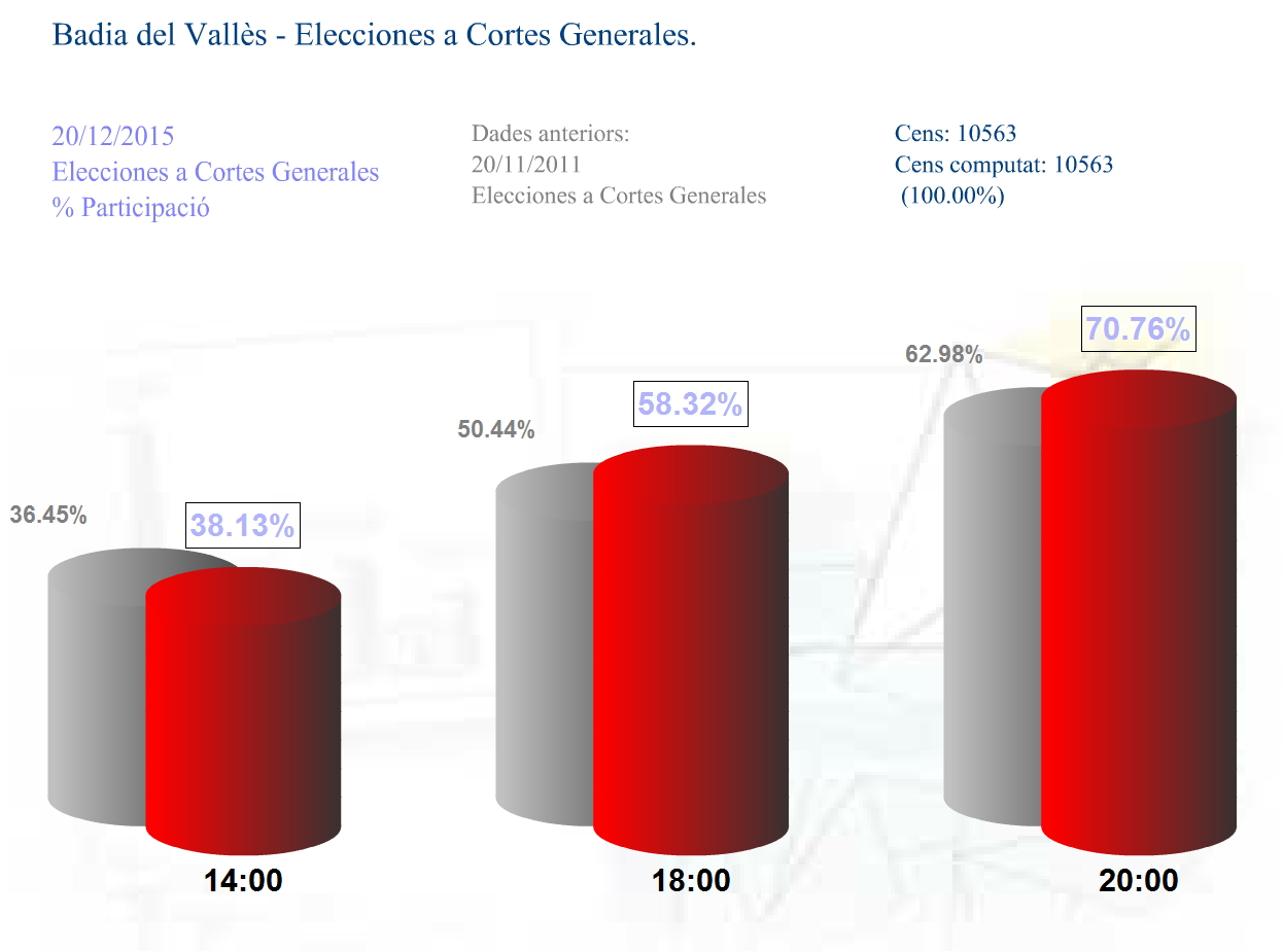 Aquesta xifra representa un 70,76 % de participació en els comicis que s'han celebrat avui dia 20 de desembre, gairebé vuit punts per sobre de la participació de fa quatre anys, que va ser del 62,98 %. Durant tota la jornada la participació ha estat força més alta de la registrada als comicis de 2011 al nostre municipi. Així, a les 14 h, la participació era del 38,13 % (davant el 36,45 % del 2011) i, a les 18 h, del 58,32 % (50,44 % al 2011).