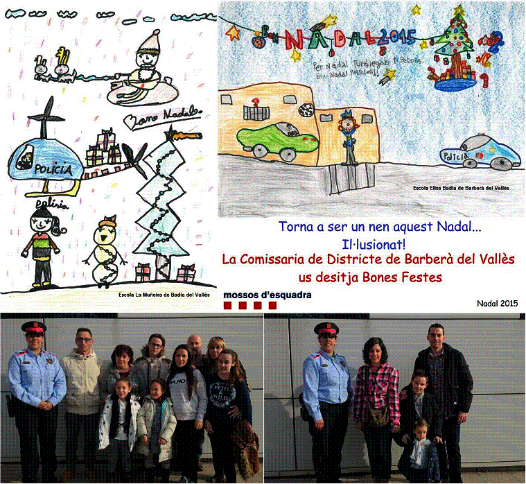 La comissaria de districte de Barberà del Vallès elabora cada any una postal per felicitar les festes i l'any nou. Enguany, a més, van organitzar el “I Concurs de la Policia i el Nadal”, on participaven dibuixos de nens i nenes de 2n curs de les escoles de primària de Barberà i Badia del Vallès. Hi van col·laborar 5 centres, entre ells les escoles La Muñeira, La Jota i Las Seguidillas de la nostra ciutat. Finalment, es va escollir d'entre els participants un dibuix guanyador de Badia i un altre de Barberà, amb els quals van realitzar la felicitació de la comissaria.