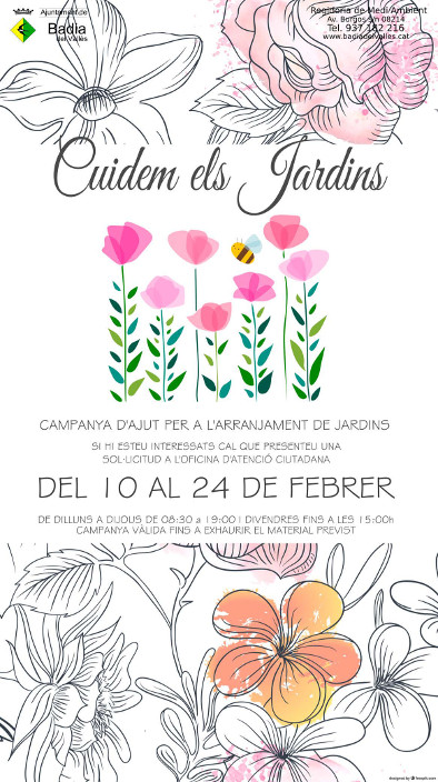 Es posa en marxa una nova campanya d'ajuts per a l'arranjament dels jardins. Així, del 10 al 24 de febrer, ambdós inclosos, totes aquelles comunitats veïnals i centres educatius interessats a sol·licitar material de jardineria (terra, adob i plantes) per a l'arranjament dels seus jardins, hauran de presentar una instància a l'Oficina d'Atenció Ciutadana (de dilluns a dijous de 8.30 a 19 h i els divendres, fins les 15 h).