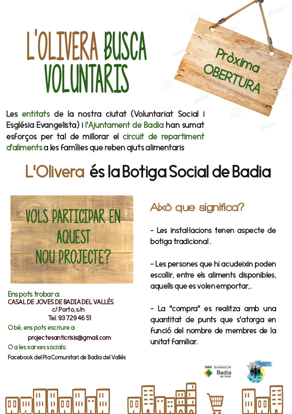 Amb aquest objectiu, s'ha creat un nou projecte: “l'Olivera”, la botiga social de Badia. Per què botiga social? L'Olivera comptarà amb unes instal·lacions