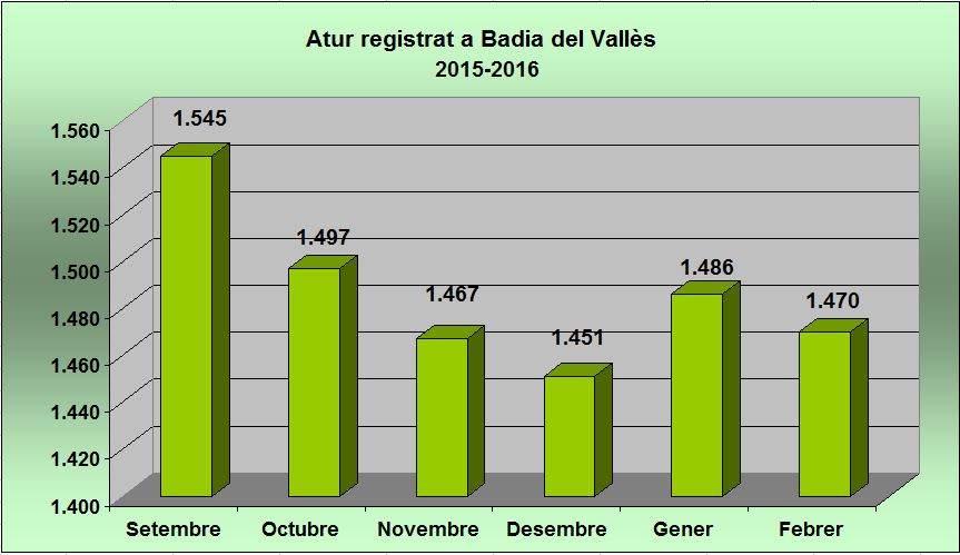 El passat mes de febrer l'atur a Badia del Vallès va baixar en 16 persones (-1,08%) fins a situar-se en les 1.470 persones registrades com a aturades al Servei d'Ocupació de Catalunya. Aquest descens és més pronunciat en termes interanuals: si comparem la xifra d'aturats/ades amb la del febrer de 2015, la davallada és del –9,82 %, 160 persones menys que respecte ara fa un any.