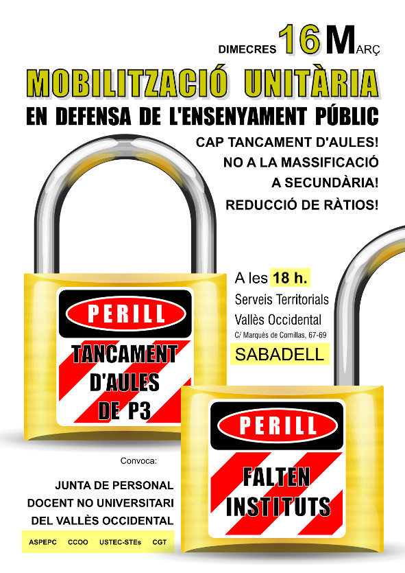 La Coordinadora de l'Ensenyament Públic del Vallès Occidental ha convocat una concentració davant els Serveis Territorials d'Ensenyament a Sabadell (c. Marquès de Comillas, 67-69) el proper dimecres, 16 de març, a les 18 hores, en defensa de l'escola pública. Entre d'altres, la plataforma defensa per a cada municipi del Vallès una moratòria en la planificació de P3, a causa de la davallada demogràfica, donant prioritat a la baixada de ràtios; plans calendaritzats a cada municipi per concretar necessitats i solucions, i autoorganització de la comunitat educativa, en connivència amb els ens locals, per fer possible les millores en l'educació pública.