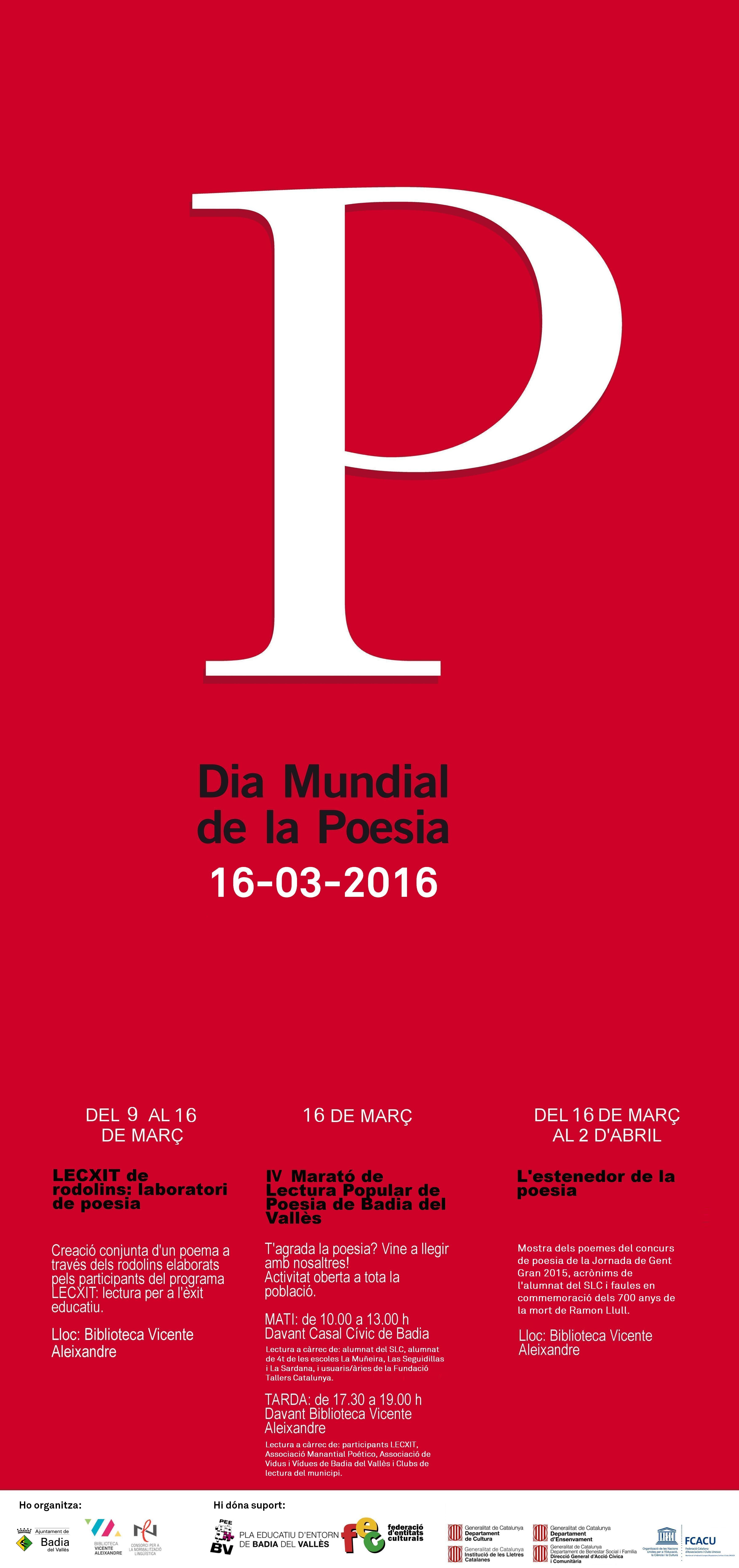 El SLC i la Biblioteca Vicente Aleixandre organitzen el proper dimecres 16 de març, la IV Marató de Lectura Popular de Poesia per celebrar el Dia Mundial de la Poesia, instituït per la UNESCO i que se celebra arreu del món el 21 de març. Badia se suma així, per quart any consecutiu, a la celebració de la gran festa de la paraula i les lletres.