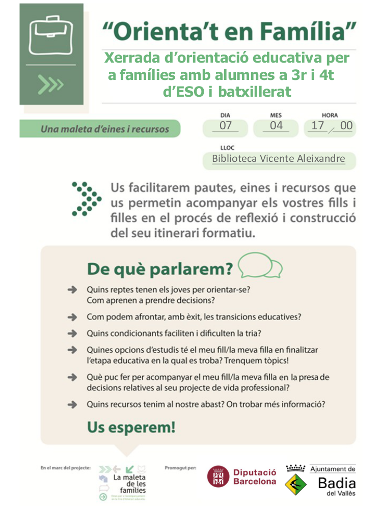 Aquesta xerrada s'ha organitzat en el marc del projecte “La Maleta de les Famílies”, de la Diputació de Barcelona, en col·laboració amb l'Ajuntament de Badia del Vallès i els dos instituts del municipi.