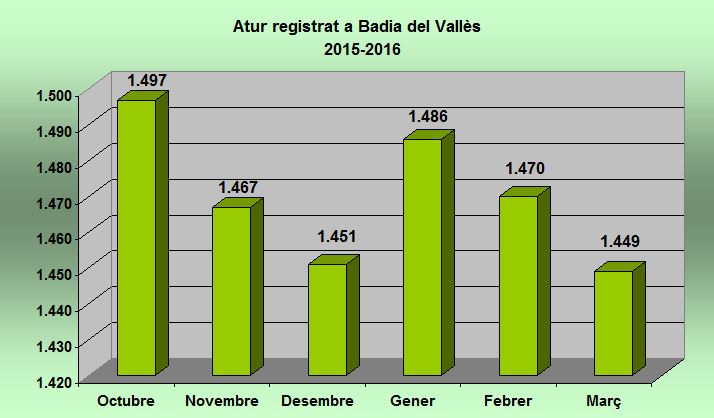 La taxa d'atur a Badia del Vallès es va situar en el 23,47 % després d'un descens de l'1,43 % en el nombre de persones registrades com a aturades al Servei d'Ocupació de Catalunya. Aquesta xifra representa una davallada de 21 persones en l'últim mes. Així mateix, en termes interanuals, la baixada va ser molt més pronunciada, de l'11,59 %, el que es tradueix en 190 persones aturades menys que respecte el març del 2015.