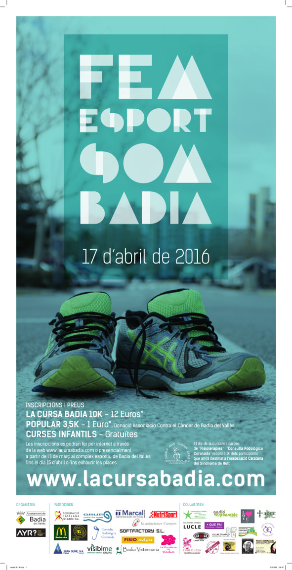 La Cursa Badia 2016 ja és aquí. Demà passat, diumenge 17 d'abril, a partir de les 10 h, se succeiran les proves, organitzades per edats i/o dificultat, que tindran la seva sortida a l'av. de Burgos (davant l'Ajuntament). Primer serà el moment de la cursa gran, la Cursa Badia 10k, adreçada a corredors/es habituals, que constarà de dues voltes a un circuit fins recórrer una distància de 10 km. Seguidament, a les 11.30 h, arribarà el torn de la Cursa Popular, oberta a tothom, amb una distància de 3,5 km.