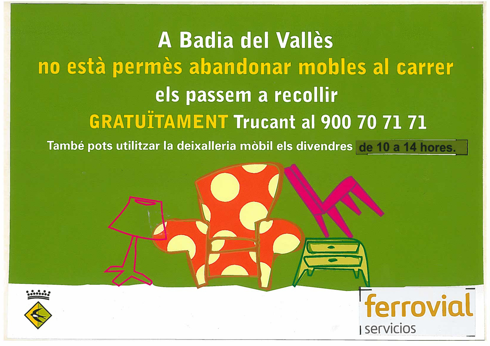 El telèfon del servei de recollida de mobles és el 900 70 71 71. També es pot utilitzar la deixalleria mòbil, els divendres de 10 a 14 hores.