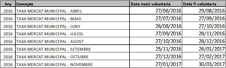 El següent punt en l'ordre del dia, la modificació al calendari fiscal de les dates de cobrament de la taxa del Mercat Municipal per al 2016, també va ser aprovat per unanimitat. Després d'aquesta modificació, les dates queden tal com s'indica en aquest quadre:
