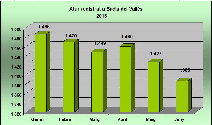 La taxa d'atur a Badia del Vallès es va situar en el 22,39 % després d'un descens del 2,87 % en el nombre de persones registrades com a aturades al Servei d'Ocupació de Catalunya, el que representa una davallada de 41 persones en l’últim mes. Pel que fa als darrers dotze mesos, la caiguda és molt més important, del 9,47%, és a dir, 145 persones menys respecte el juny de l'any passat. En total, hi ha 1.386 persones registrades com a aturades a la nostra ciutat, de les quals 744 són dones i 642, homes. Per trams d'edat, hi ha 126 menors de 25 anys a l'atur, 591 d'entre 25 i 44 anys, i 669 persones aturades majors de 45.