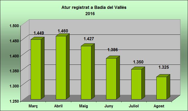El nombre de persones residents a Badia inscrites com a aturades al Servei d'Ocupació de Catalunya va caure al mes d'agost un 1,85 %, el que es tradueix en 25 persones aturades menys. Pel que fa als darrers dotze mesos, la caiguda va ser molt més pronunciada, del 10,35 %, és a dir, 153 persones aturades menys que a l'agost del 2015. Així, la taxa d'atur al mes d'agost a Badia es va situar en el 21,38 %.