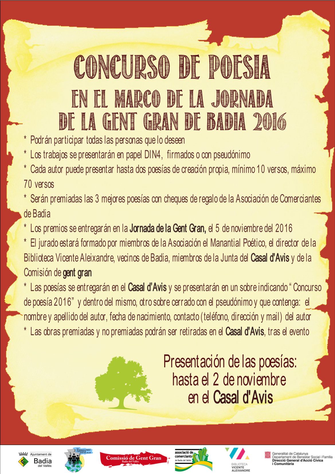 Tothom qui ho desitgi pot presentar fins a dues poesies de creació pròpia, en català o en castellà, amb un mínim de 10 versos i un màxim de 70. Les composicions, signades o amb pseudònim, s'han de lliurar al Casal d'Avis, en paper mida DIN A4, en un sobre que indiqui “Concurs de poesia 2016” i, dins d'aquest, un altre sobre tancat amb el pseudònim escrit i que contingui el nom i el cognom de l'autor, la data de naixement i les dades de contacte (telèfon, adreça i correu electrònic). El termini de presentació de treballs finalitza el 2 de novembre.