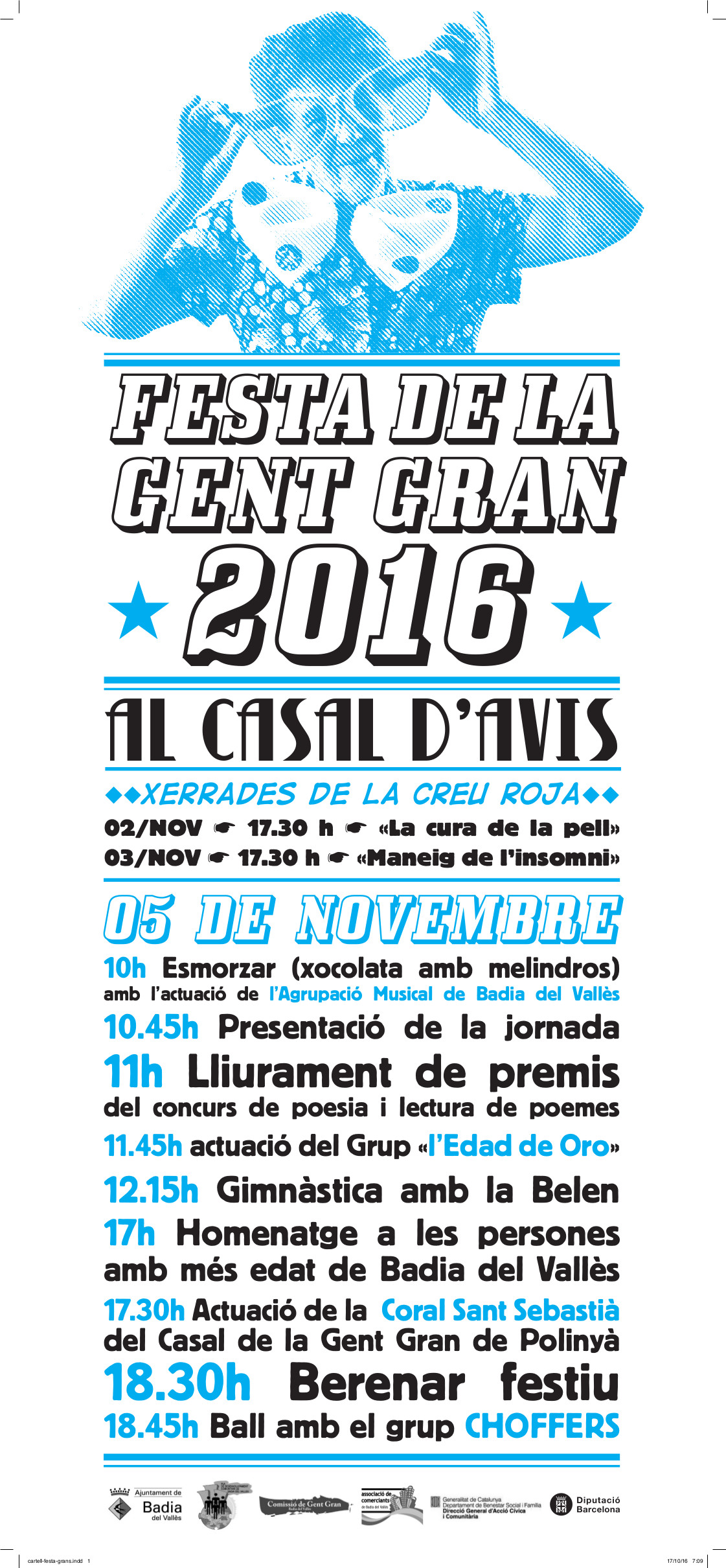 La festa començarà de bon matí, a les 10 h, amb un esmorzar a base de xocolata amb melindros, amenitzat per l'actuació de l'Agrupació Musical de Badia del Vallès. A més, entre els actes més destacats, a les 11 h, hi haurà el lliurament de premis del concurs de poesia. A la tarda, a les 17 h, serà el moment de l'homenatge a les persones de més edat de Badia del Vallès. I a les 18.30 h, hi haurà un berenar festiu acompanyat de ball amb el grup Choffers (a partir de les 18.45 h). Si voleu consultar tots els actes del dia, podeu fer clic al cartell de la Festa de la Gent Gran 2016.