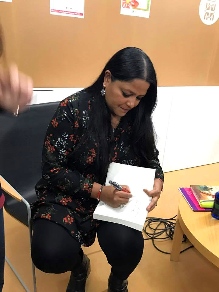 seu llibre. Els assistents, gairebé un centenar de persones que van fer petita la sala, van poder gaudir de les explicacions de l'autora sobre la cultura de l’Índia, l'adopció, el paper de la dona, l'explotació infantil, etc. L'autora a més, va atendre les preguntes de la gent i va signar exemplars dels seu llibre, que es podien adquirir a la mateixa biblioteca.