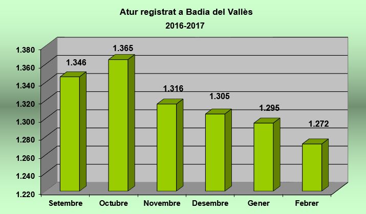El nombre de persones registrades com a aturades al Servei d'Ocupació de Catalunya a Badia del Vallés va tornar a experimentar un lleu descens al mes de febrer, concretament un 1,78% menys respecte el mes anterior (23 persones menys). En termes interanuals, la caiguda va ser més pronunciada, del 13,47%, o el que és el mateix, 198 persones menys que al febrer de 2016. La taxa d'atur registral, segons les dades ofertes per la Diputació de Barcelona, va quedar situada en el 20,55%.