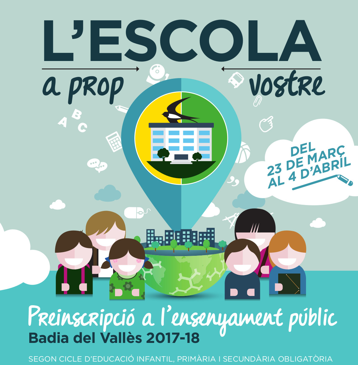 El període de preinscripció a l'ensenyament públic per al segon cicle d'educació infantil, educació primària i educació secundària obligatòria a les escoles i instituts de Badia del Vallès comença demà, 23 de març, i finalitzarà el 4 d'abril. La preinscripció es pot fer de manera presencial o telemàtica. En aquest segon cas, perquè el tràmit tingui efecte, cal imprimir, signar i presentar el comprovant (en paper) acompanyat de la documentació, al centre demanat en primer lloc, dins el termini previst per a la presentació de la documentació.