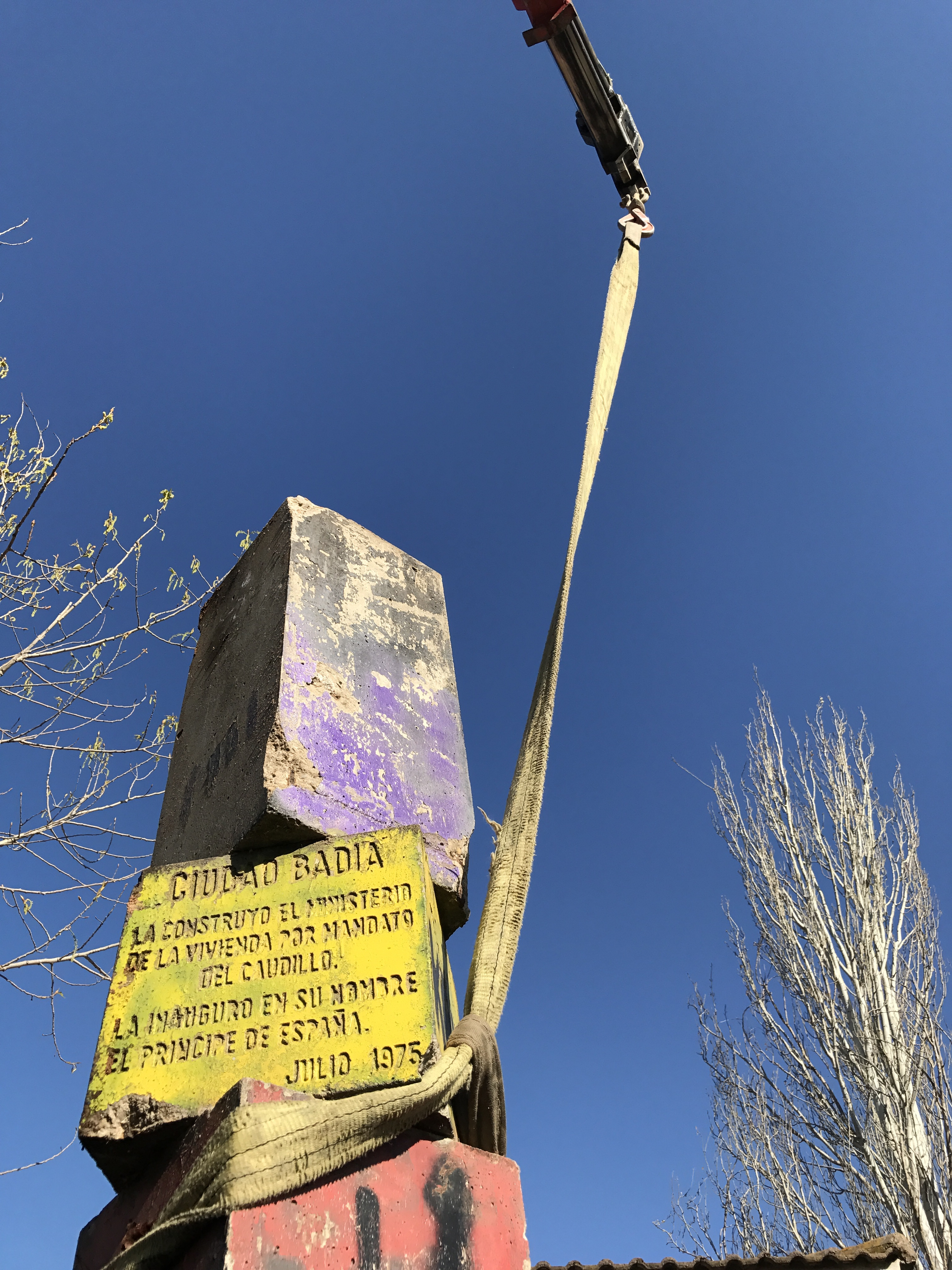 Efectius de la brigada d'obres municipal van procedir a la retirada, la setmana passada, del monòlit situat al carrer de Santander i que recordava la inauguració de l'aleshores Ciutat Badia. La retirada del monument respon al compliment d'un acord del Ple municipal que va decidir, per unanimitat, treure'l de la via pública perquè incloïa referències d'exaltació personal a la figura del dictador Francisco Franco.