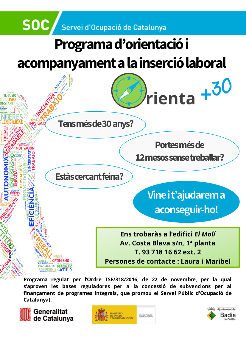 L'Ajuntament de Badia del Vallès, en col·laboració amb les entitats Fundació Barberà Promoció de l'Ajuntament de Barberà del Vallès, Fundació Privada ECOM de Sabadell, Fundació Secretariado Gitano de Sabadell i Servei de Promoció Econòmica de l'Ajuntament de Sabadell, ha iniciat el Programa d'orientació i acompanyament a la inserció laboral Orienta+30, programa subvencionat pel Servei Públic d'Ocupació de Catalunya i el Ministeri d'Ocupació i Seguretat Social.