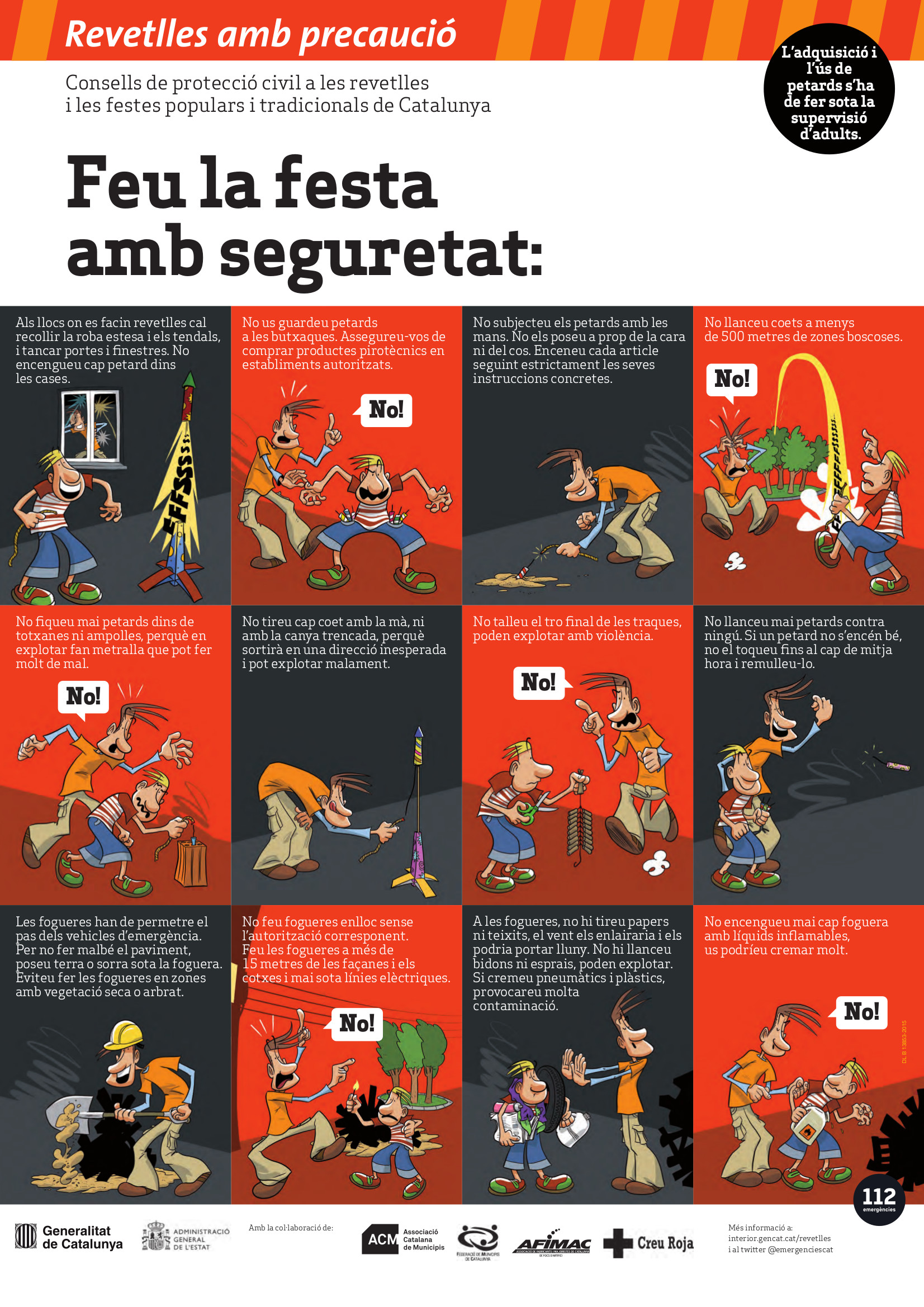 Recordeu, a més, de no llançar coets a menys de 500 m de zones boscoses ni en aglomeracions de persones. No encengueu cap petard a l'interior de casa ni llenceu o manipuleu petards des de balcons o finestres. Recolliu la roba estesa i els tendals i, si escau, tanqueu portes i finestres.