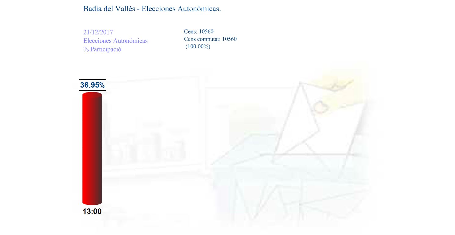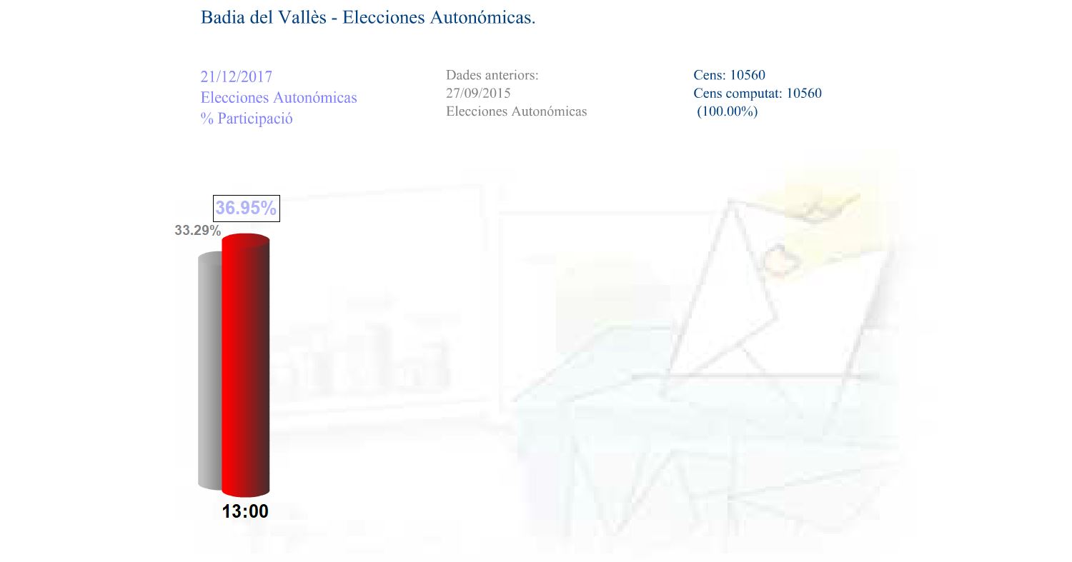 Les primeres dades de participació en les Eleccions al Parlament de Catalunya d'aquest 21 de desembre de 2017, corresponents a les 13 h, s'han conegut fa poca estona. A aquesta hora, Badia del Vallès registrava una participació del 36.95%, un 3.6% més que la participació registrada a la mateixa hora en els anteriors comicis autonòmics, que es van celebrar el 2015. Aleshores, la xifra va ser del 33.29%.