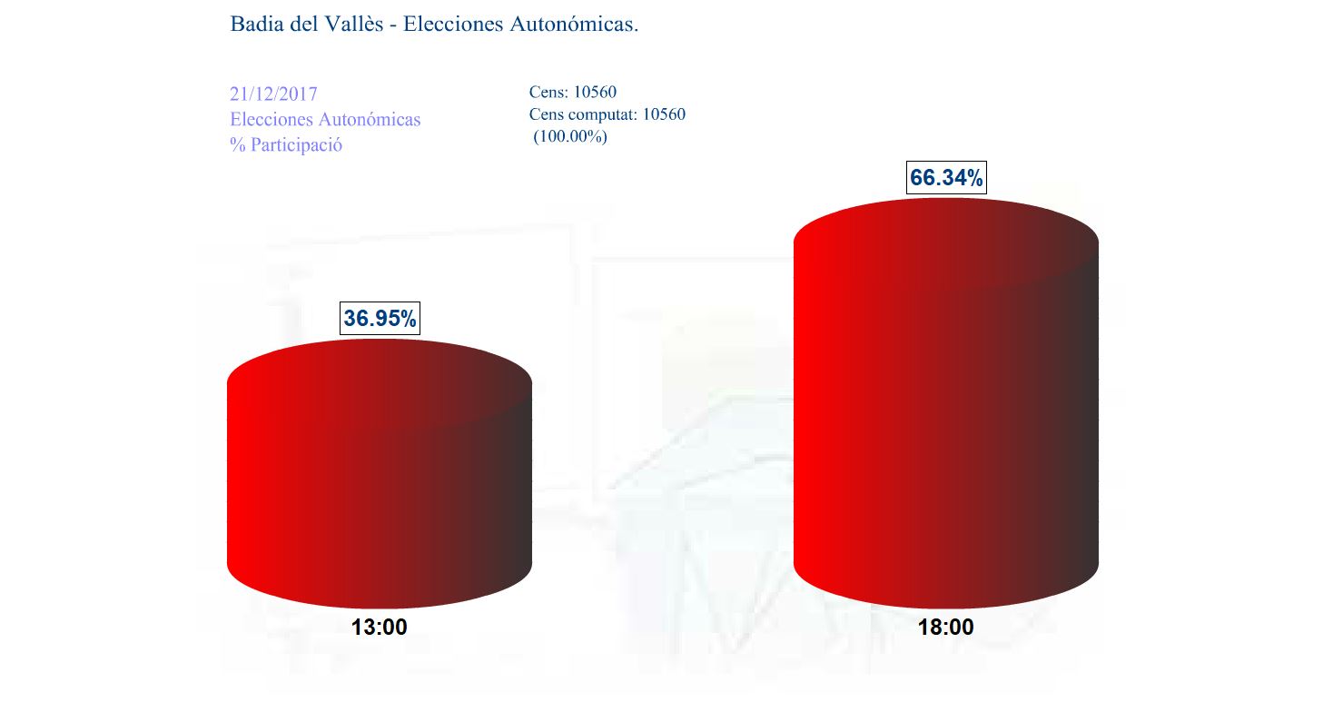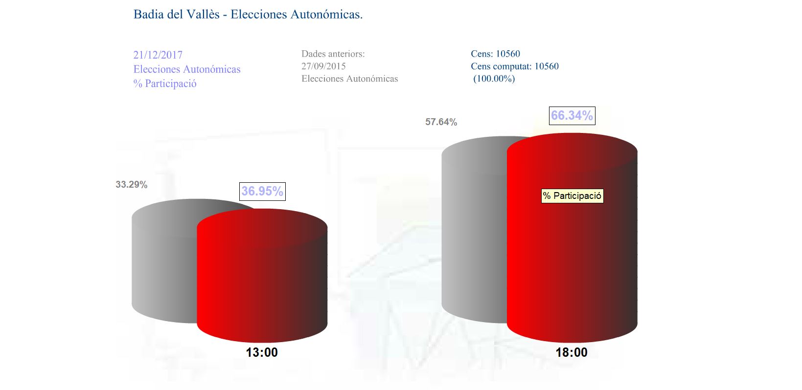La participació a les Eleccions al Parlament de Catalunya d'aquest 21 de desembre, a les 18 h a Badia del Vallès, és del 66,34 %, molt més alta que el 57,64 % que es registrava a la mateixa hora a les anteriors eleccions autonòmiques del 2015, amb un increment, doncs, de gairebé nou punts (8,7%).