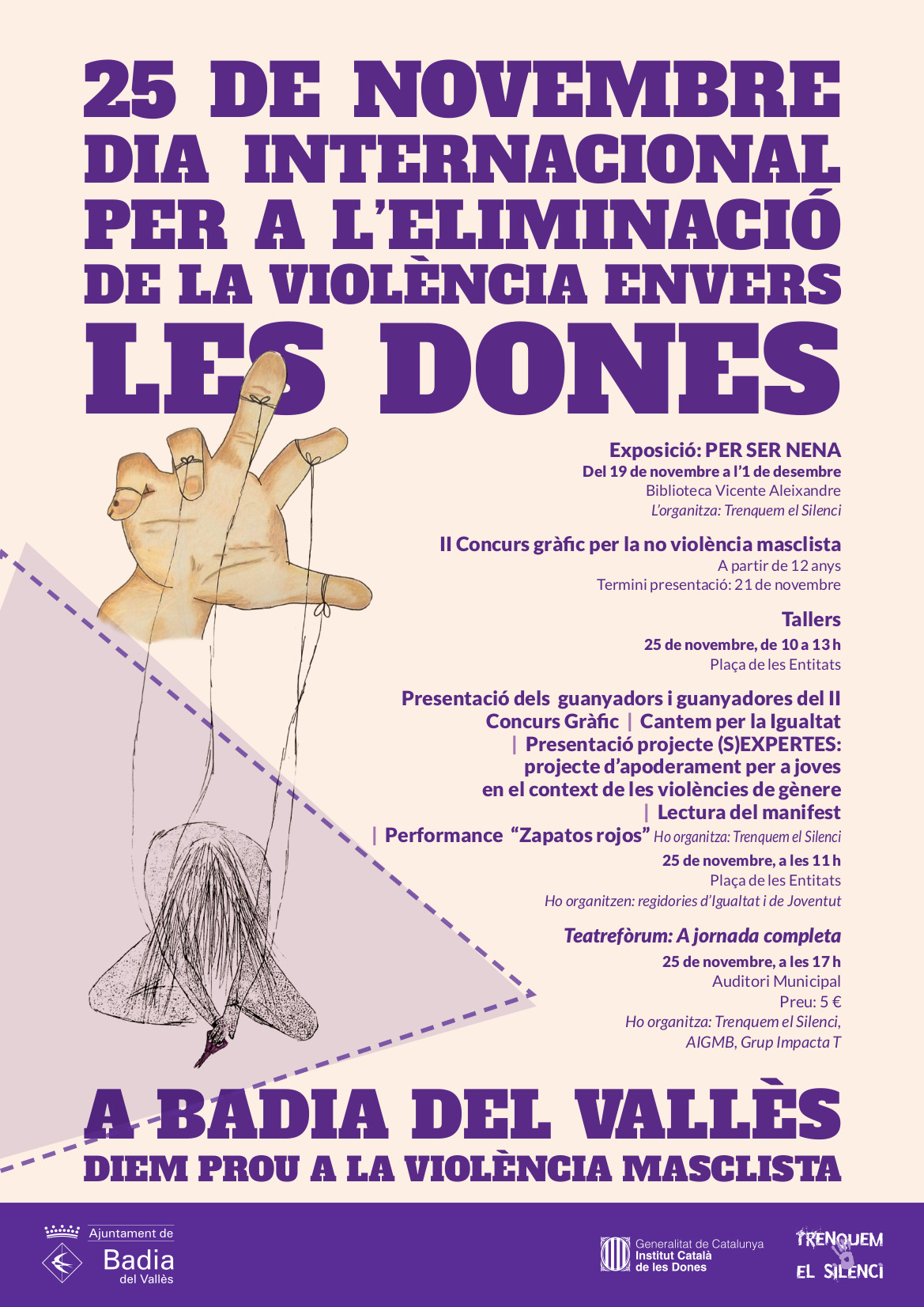 Aquest diumenge, 25 de novembre, se celebra el Dia Internacional per a l'Eliminació de la Violència envers les Dones. Badia se suma a la commemoració amb diversos actes de sensibilització i denúncia.