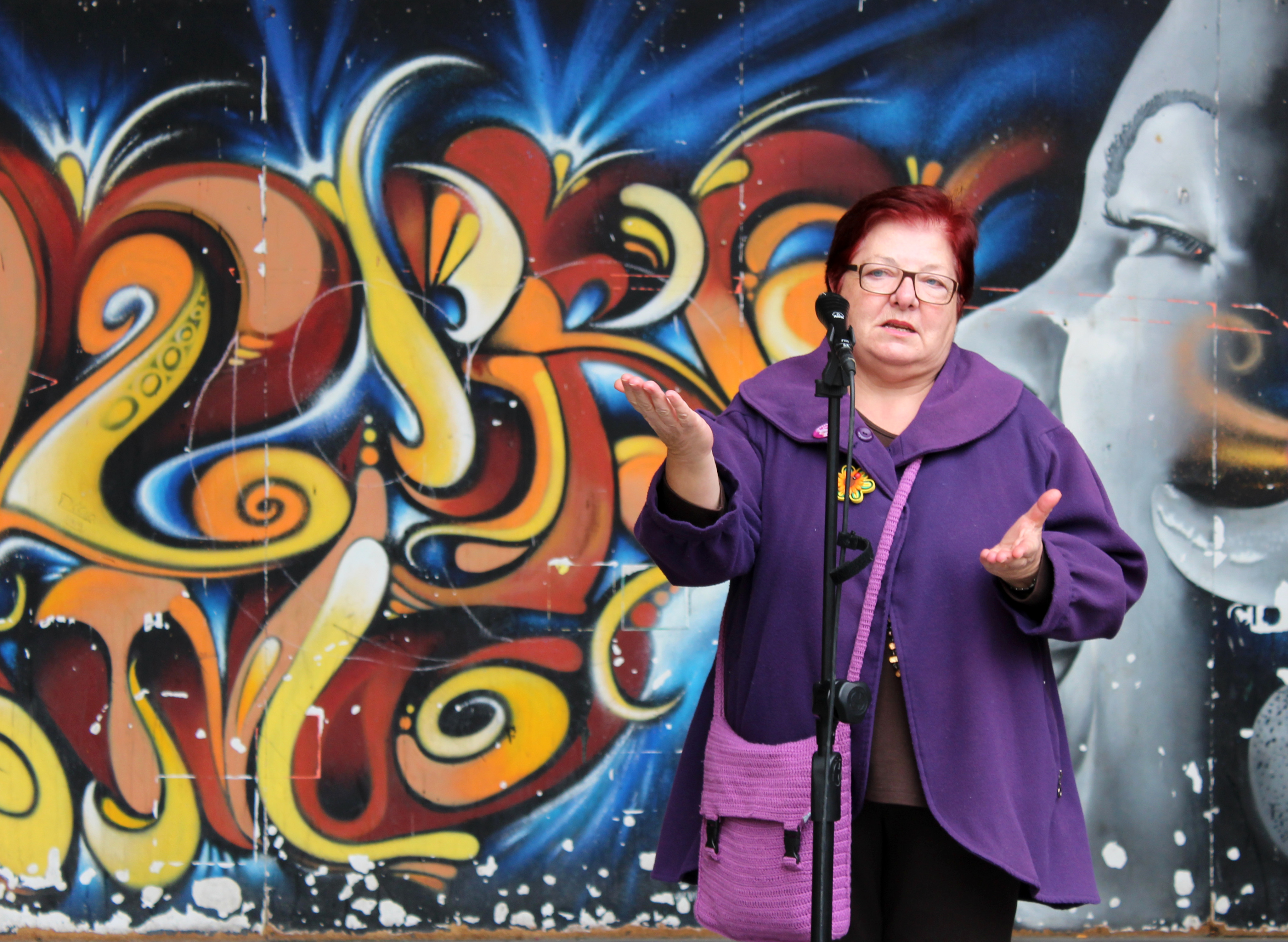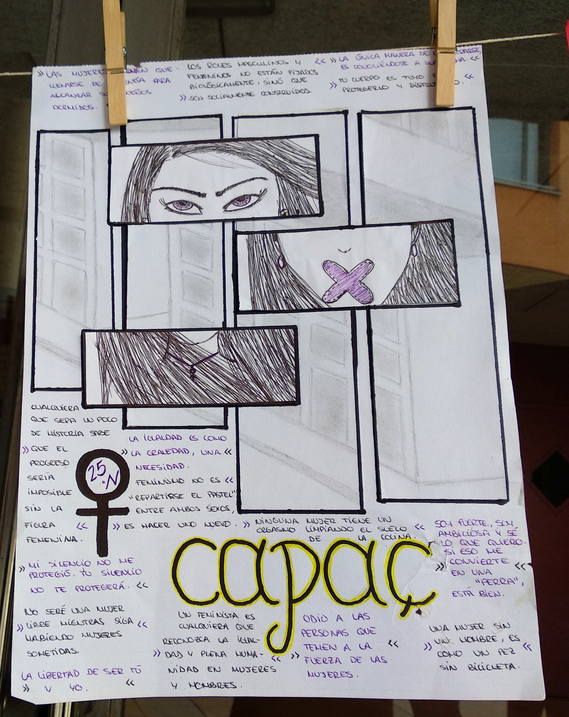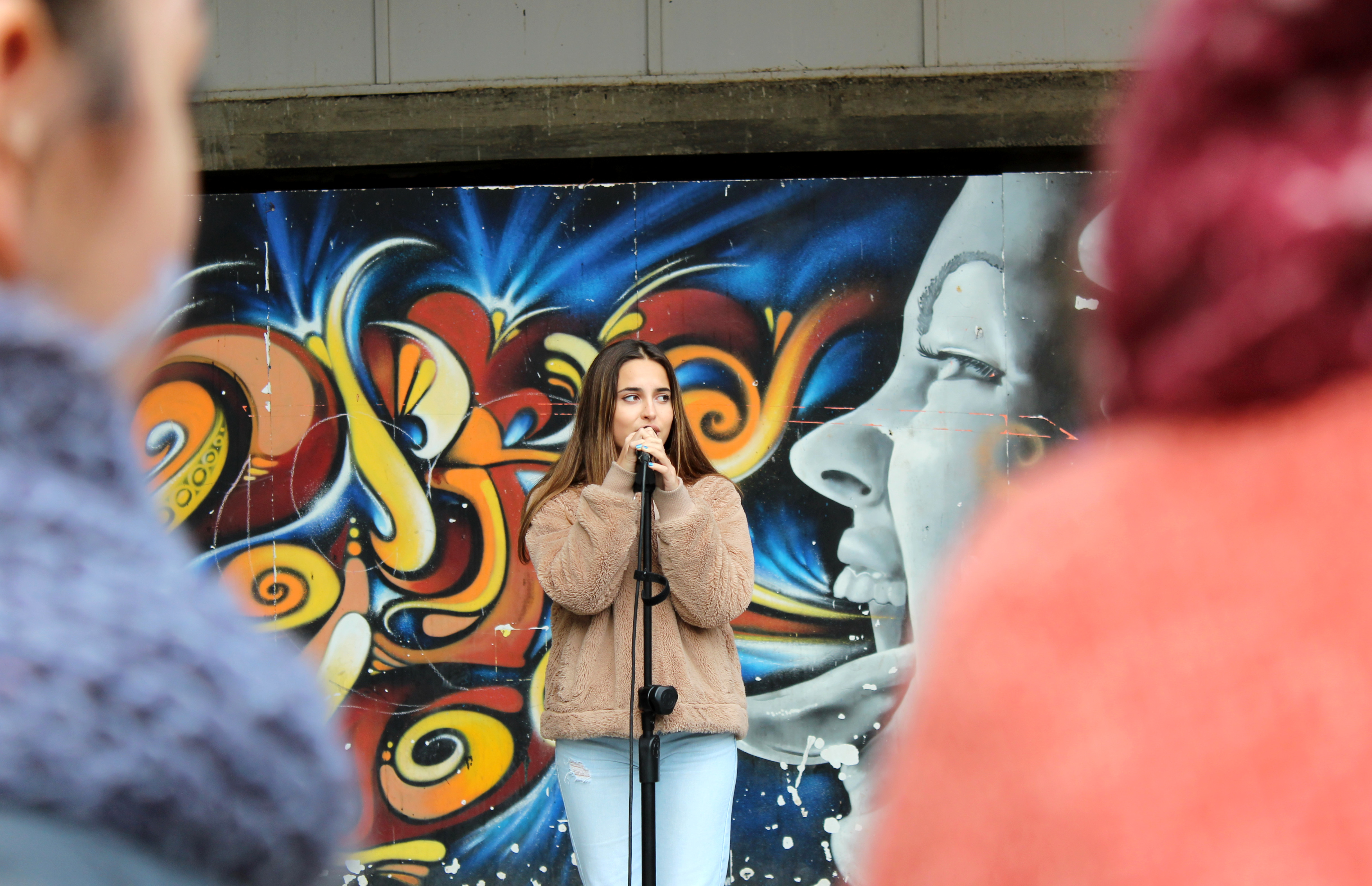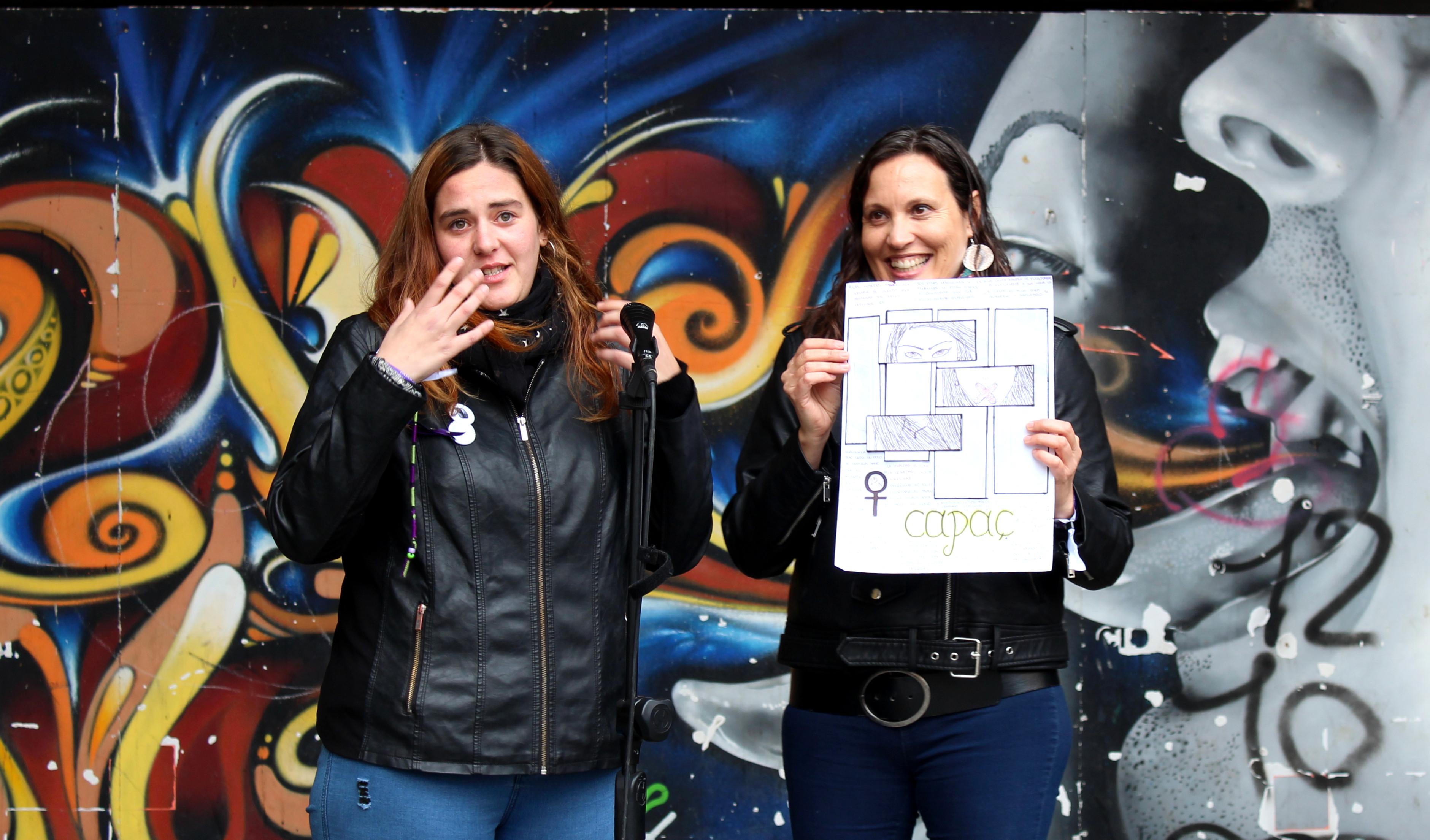 Cristina Martínez, guanyadora del concurs gràfic, explica la seva obra, 'Capaç', que mostra la tècnica d'Igualtat de l'Ajuntament, Núria Navales  Lucía Garrancho va protagonitzar una de les actuacions  Marta Gamero va cantar 'Beautiful'