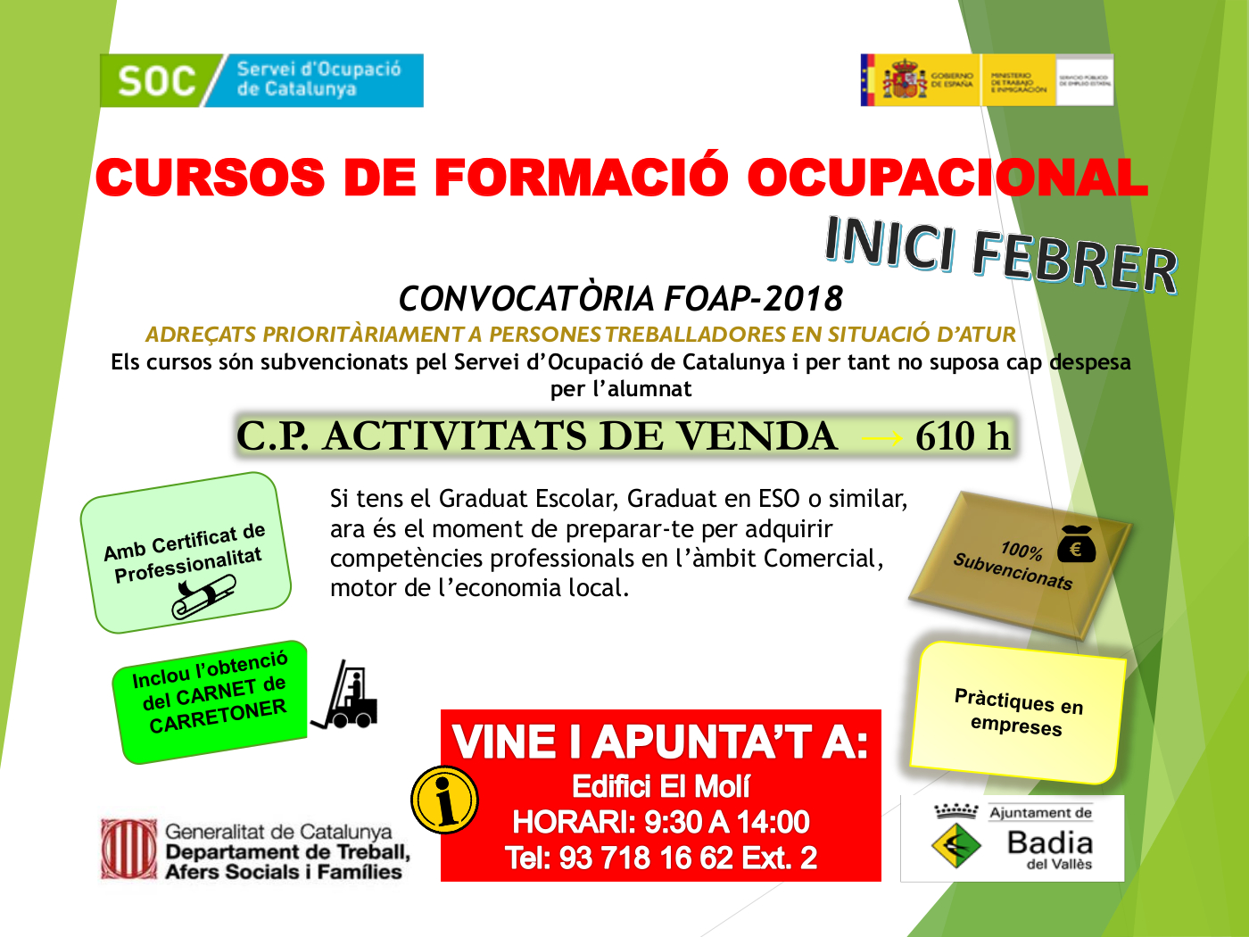Si t'agrada l'atenció al públic i ets una persona oberta i dinàmica, aquest és el teu curs. És totalment gratuït, 100% subvencionat i amb pràctiques a empreses perquè surtis totalment preparat per treballar ja. Per accedir només cal que tinguis el graduat escolar, graduat en ESO o similar.