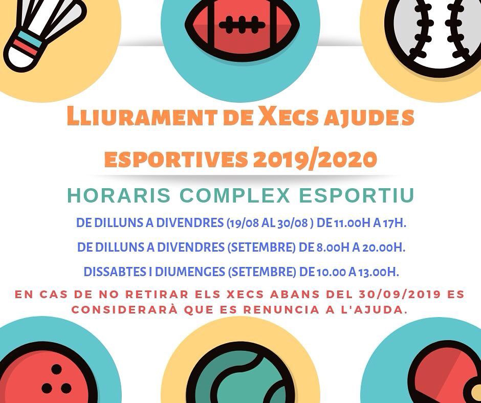 Des del 19 d'agost i fins al 30 de setembre, tens temps de recollir, en el Complex Esportiu, el teu xec esportiu si has estat becat. En cas que no retiris el teu xec, es considerarà que renuncies a l'ajuda.