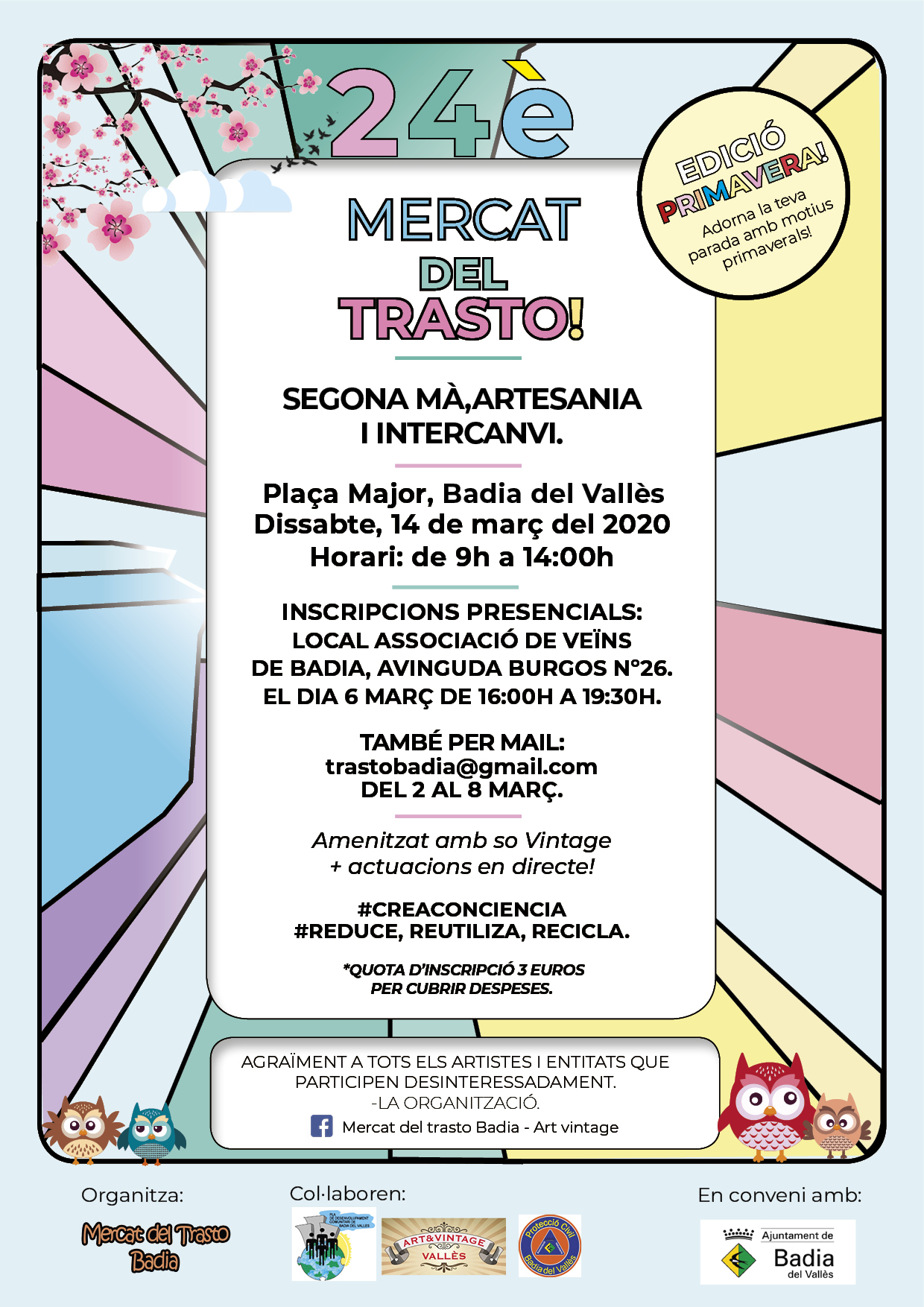 Per participar com a venedor, et pots inscriure divendres, 6 de març, al local de l'Associació de Veïns de Badia (avinguda de Burgos, 26), de 16 a 19.30 hores. La quota d'inscripció és de 3 euros, per cobrir les despeses. També et pots inscriure per correu electrònic a trastobadia